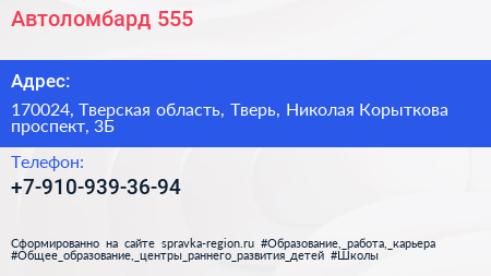 Автоломбард 555 по адресу 170024, Тверская область, Тверь, Николая Корыткова проспект, 3Б в дальнейшем Организация, размещена в следующих категориях: