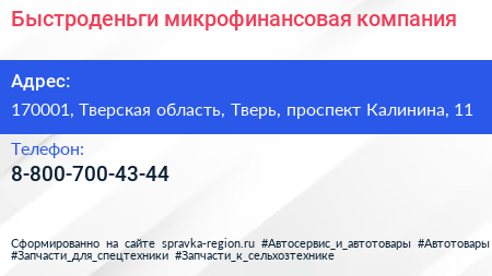 Быстроденьги, микрофинансовая компания по адресу 170001, Тверская область, Тверь, проспект Калинина, 11 в дальнейшем Организация, размещена в следующих категориях:
