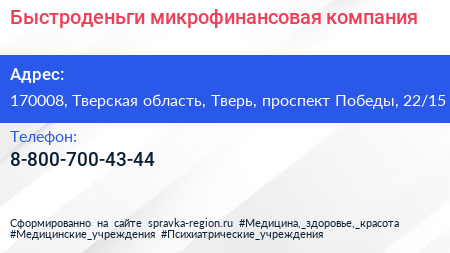 Быстроденьги, микрофинансовая компания по адресу 170008, Тверская область, Тверь, проспект Победы, 22/15 в дальнейшем Организация, размещена в следующих категориях: