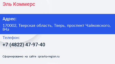 Эль Коммерс по адресу 170002, Тверская область, Тверь, проспект Чайковского, 84а в дальнейшем Организация, размещена в следующих категориях: