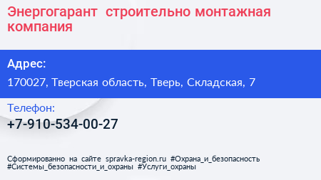 Энергогарант+, строительно-монтажная компания по адресу 170027, Тверская область, Тверь, Складская, 7 в дальнейшем Организация, размещена в следующих категориях: