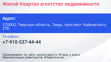 Жилой Квартал, агентство недвижимости по адресу 170002, Тверская область, Тверь, проспект Чайковского, 27Б в дальнейшем Организация, размещена в следующих категориях: