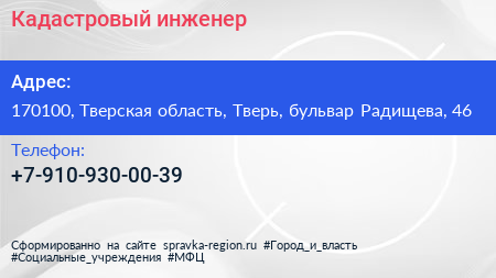 Кадастровый инженер по адресу 170100, Тверская область, Тверь, бульвар Радищева, 46 в дальнейшем Организация, размещена в следующих категориях: