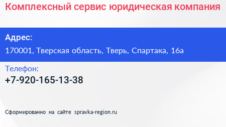 Комплексный сервис, юридическая компания по адресу 170001, Тверская область, Тверь, Спартака, 16а в дальнейшем Организация, размещена в следующих категориях: