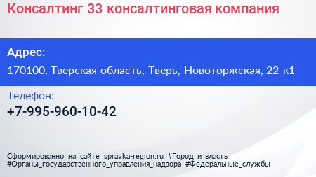 Консалтинг 33, консалтинговая компания по адресу 170100, Тверская область, Тверь, Новоторжская, 22 к1 в дальнейшем Организация, размещена в следующих категориях: