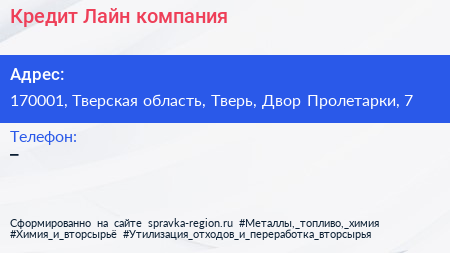 Кредит Лайн, компания по адресу 170001, Тверская область, Тверь, Двор Пролетарки, 7 в дальнейшем Организация, размещена в следующих категориях: