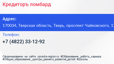 Кредиторъ, ломбард по адресу 170034, Тверская область, Тверь, проспект Чайковского, 17 в дальнейшем Организация, размещена в следующих категориях: