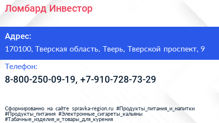 Ломбард Инвестор по адресу 170100, Тверская область, Тверь, Тверской проспект, 9 в дальнейшем Организация, размещена в следующих категориях: