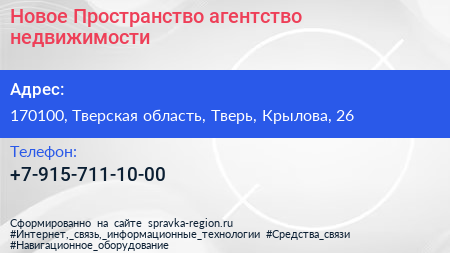 Новое Пространство, агентство недвижимости по адресу 170100, Тверская область, Тверь, Крылова, 26 в дальнейшем Организация, размещена в следующих категориях: