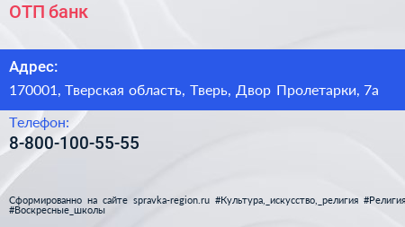 ОТП банк по адресу 170001, Тверская область, Тверь, Двор Пролетарки, 7а в дальнейшем Организация, размещена в следующих категориях: