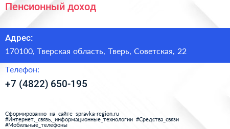 Пенсионный доход по адресу 170100, Тверская область, Тверь, Советская, 22 в дальнейшем Организация, размещена в следующих категориях: