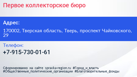 Первое коллекторское бюро по адресу 170002, Тверская область, Тверь, проспект Чайковского, 29 в дальнейшем Организация, размещена в следующих категориях: