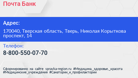 Почта Банк по адресу 170040, Тверская область, Тверь, Николая Корыткова проспект, 14 в дальнейшем Организация, размещена в следующих категориях: