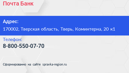 Почта Банк по адресу 170002, Тверская область, Тверь, Коминтерна, 20 к1 в дальнейшем Организация, размещена в следующих категориях:
