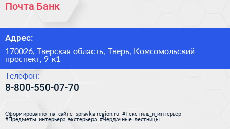 Почта Банк по адресу 170026, Тверская область, Тверь, Комсомольский проспект, 9 к1 в дальнейшем Организация, размещена в следующих категориях: