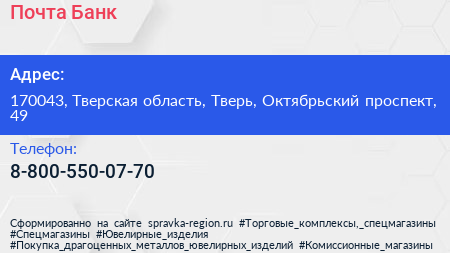 Почта Банк по адресу 170043, Тверская область, Тверь, Октябрьский проспект, 49 в дальнейшем Организация, размещена в следующих категориях: