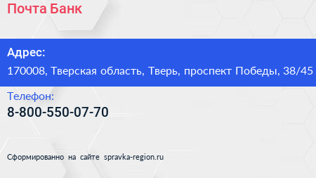 Почта Банк по адресу 170008, Тверская область, Тверь, проспект Победы, 38/45 в дальнейшем Организация, размещена в следующих категориях: