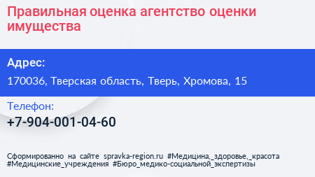 Правильная оценка, агентство оценки имущества по адресу 170036, Тверская область, Тверь, Хромова, 15 в дальнейшем Организация, размещена в следующих категориях: