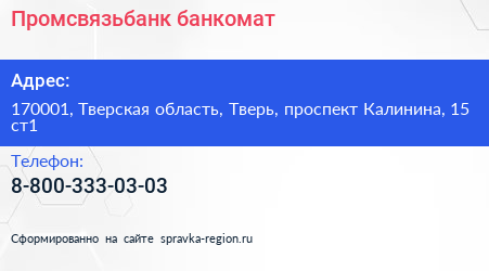 Промсвязьбанк, банкомат по адресу 170001, Тверская область, Тверь, проспект Калинина, 15 ст1 в дальнейшем Организация, размещена в следующих категориях: