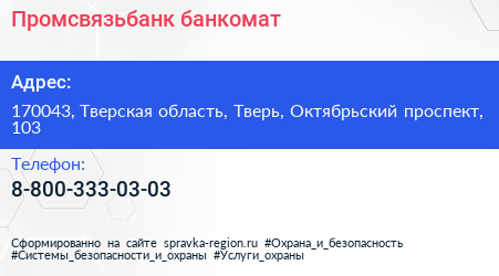 Промсвязьбанк, банкомат по адресу 170043, Тверская область, Тверь, Октябрьский проспект, 103 в дальнейшем Организация, размещена в следующих категориях: