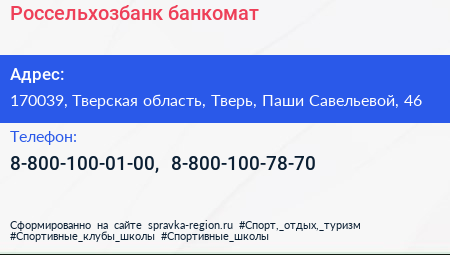 Россельхозбанк, банкомат по адресу 170039, Тверская область, Тверь, Паши Савельевой, 46 в дальнейшем Организация, размещена в следующих категориях: