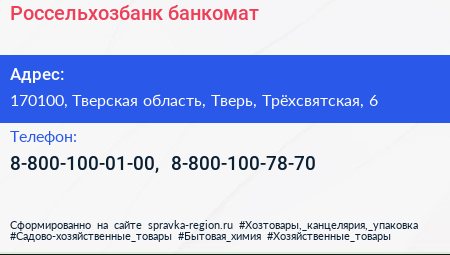 Россельхозбанк, банкомат по адресу 170100, Тверская область, Тверь, Трёхсвятская, 6 в дальнейшем Организация, размещена в следующих категориях: