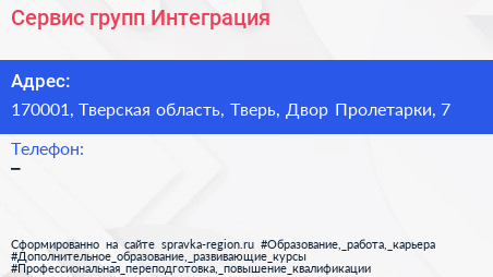 Сервис-групп Интеграция по адресу 170001, Тверская область, Тверь, Двор Пролетарки, 7 в дальнейшем Организация, размещена в следующих категориях: