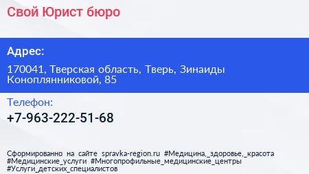 Свой Юрист, бюро по адресу 170041, Тверская область, Тверь, Зинаиды Коноплянниковой, 85 в дальнейшем Организация, размещена в следующих категориях: