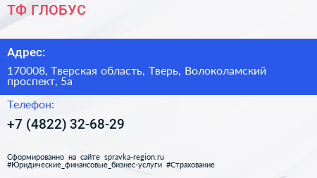 ТФ ГЛОБУС по адресу 170008, Тверская область, Тверь, Волоколамский проспект, 5а в дальнейшем Организация, размещена в следующих категориях: