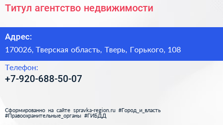 Титул, агентство недвижимости по адресу 170026, Тверская область, Тверь, Горького, 108 в дальнейшем Организация, размещена в следующих категориях: