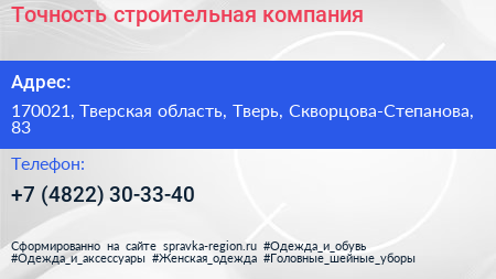 Точность, строительная компания по адресу 170021, Тверская область, Тверь, Скворцова-Степанова, 83 в дальнейшем Организация, размещена в следующих категориях: