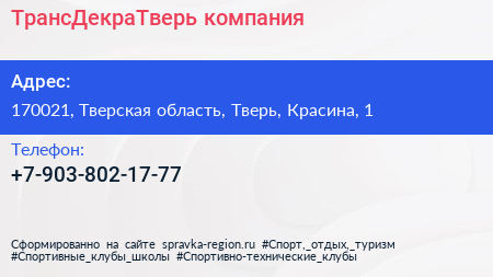 ТрансДекраТверь, компания по адресу 170021, Тверская область, Тверь, Красина, 1 в дальнейшем Организация, размещена в следующих категориях: