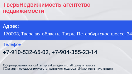 ТверьНедвижимость, агентство недвижимости по адресу 170003, Тверская область, Тверь, Петербургское шоссе, 34 в дальнейшем Организация, размещена в следующих категориях: