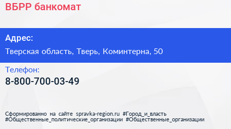 ВБРР, банкомат по адресу Тверская область, Тверь, Коминтерна, 50 в дальнейшем Организация, размещена в следующих категориях: