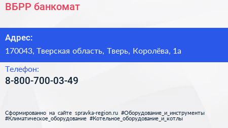 ВБРР, банкомат по адресу 170043, Тверская область, Тверь, Королёва, 1а в дальнейшем Организация, размещена в следующих категориях:
