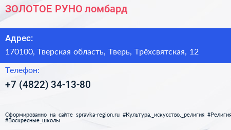 ЗОЛОТОЕ РУНО, ломбард по адресу 170100, Тверская область, Тверь, Трёхсвятская, 12 в дальнейшем Организация, размещена в следующих категориях: