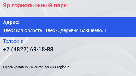 Яр, горнолыжный парк по адресу Тверская область, Тверь, деревня Бакшеево, 1 в дальнейшем Организация, размещена в следующих категориях: