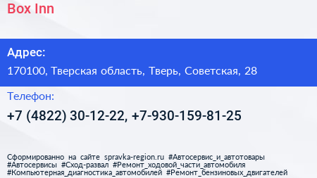 Box Inn по адресу 170100, Тверская область, Тверь, Советская, 28 в дальнейшем Организация, размещена в следующих категориях: