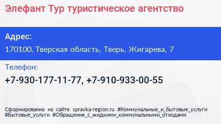 Элефант Тур, туристическое агентство по адресу 170100, Тверская область, Тверь, Жигарева, 7 в дальнейшем Организация, размещена в следующих категориях: