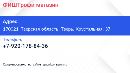 ФИШТрофи, магазин по адресу 170021, Тверская область, Тверь, Хрустальная, 37 в дальнейшем Организация, размещена в следующих категориях: