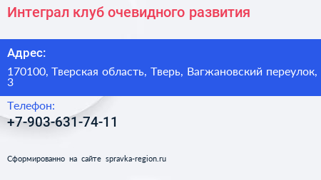 Интеграл, клуб очевидного развития по адресу 170100, Тверская область, Тверь, Вагжановский переулок, 3 в дальнейшем Организация, размещена в следующих категориях: