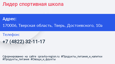 Лидер, спортивная школа по адресу 170006, Тверская область, Тверь, Достоевского, 10а в дальнейшем Организация, размещена в следующих категориях: