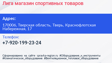 Лига, магазин спортивных товаров по адресу 170006, Тверская область, Тверь, Краснофлотская Набережная, 17 в дальнейшем Организация, размещена в следующих категориях: