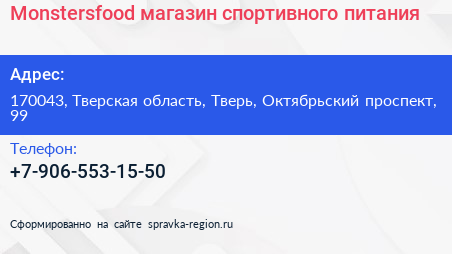 Monstersfood, магазин спортивного питания по адресу 170043, Тверская область, Тверь, Октябрьский проспект, 99 в дальнейшем Организация, размещена в следующих категориях: