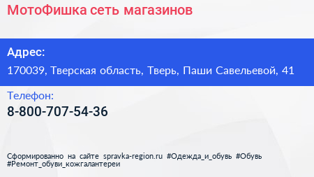 МотоФишка, сеть магазинов по адресу 170039, Тверская область, Тверь, Паши Савельевой, 41 в дальнейшем Организация, размещена в следующих категориях:
