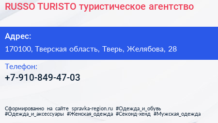 RUSSO TURISTO, туристическое агентство по адресу 170100, Тверская область, Тверь, Желябова, 28 в дальнейшем Организация, размещена в следующих категориях: