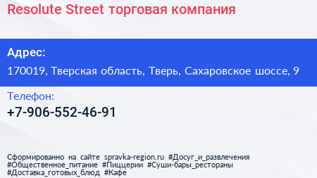 Resolute Street, торговая компания по адресу 170019, Тверская область, Тверь, Сахаровское шоссе, 9 в дальнейшем Организация, размещена в следующих категориях: