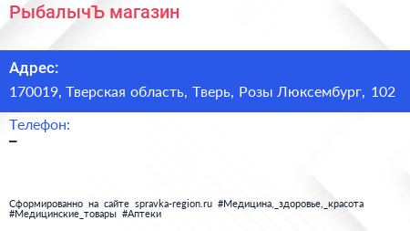 РыбалычЪ, магазин по адресу 170019, Тверская область, Тверь, Розы Люксембург, 102 в дальнейшем Организация, размещена в следующих категориях: