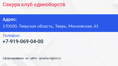 Сакура, клуб единоборств по адресу 170100, Тверская область, Тверь, Московская, 61 в дальнейшем Организация, размещена в следующих категориях: