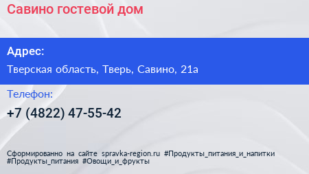 Савино, гостевой дом по адресу Тверская область, Тверь, Савино, 21а в дальнейшем Организация, размещена в следующих категориях: